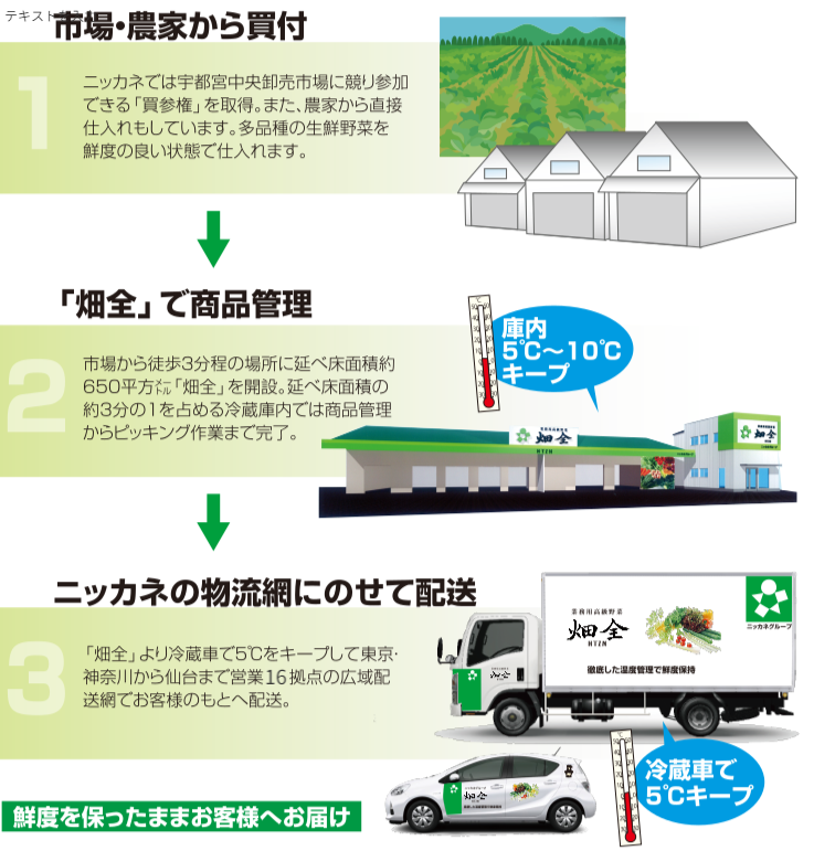「畑全」では新鮮な野菜をお届けするため、徹底した品質管理に取り組んでおります。のべ床面積の約3分の1を占める冷蔵庫を完備し、庫内でピッキング作業まで完了。